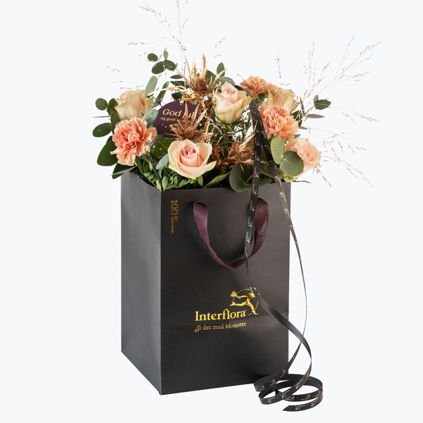 En fin harmonisk blomstrende bukett i lyse delikate toner som leveres i Interfloras eksklusive gavepose. Si det med blomster!